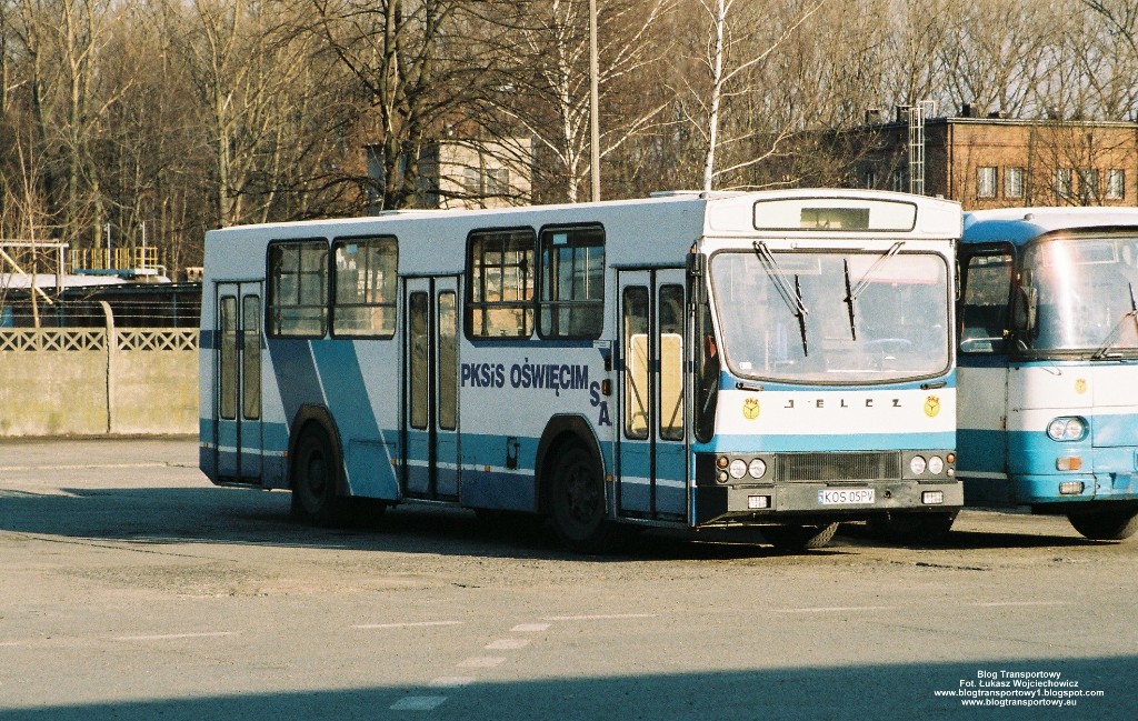 Poniższe zdjęcie zrobiłem w czwartek, 31 marca 2005. Na początek Jelcz L-11 o rejestracji KOS 05PV. Rocznik 1987. Wówczas najnowszy w PKSiS Oświęcim zakup tego modelu autobusu. Przewoźnik odkupił go od PKS Chrzanów w 2004 roku. Był przeznaczony na części dla innych oświęcimskich Jelczy, ale zmieniono decyzję i stał się eksploatowanym pojazdem.
